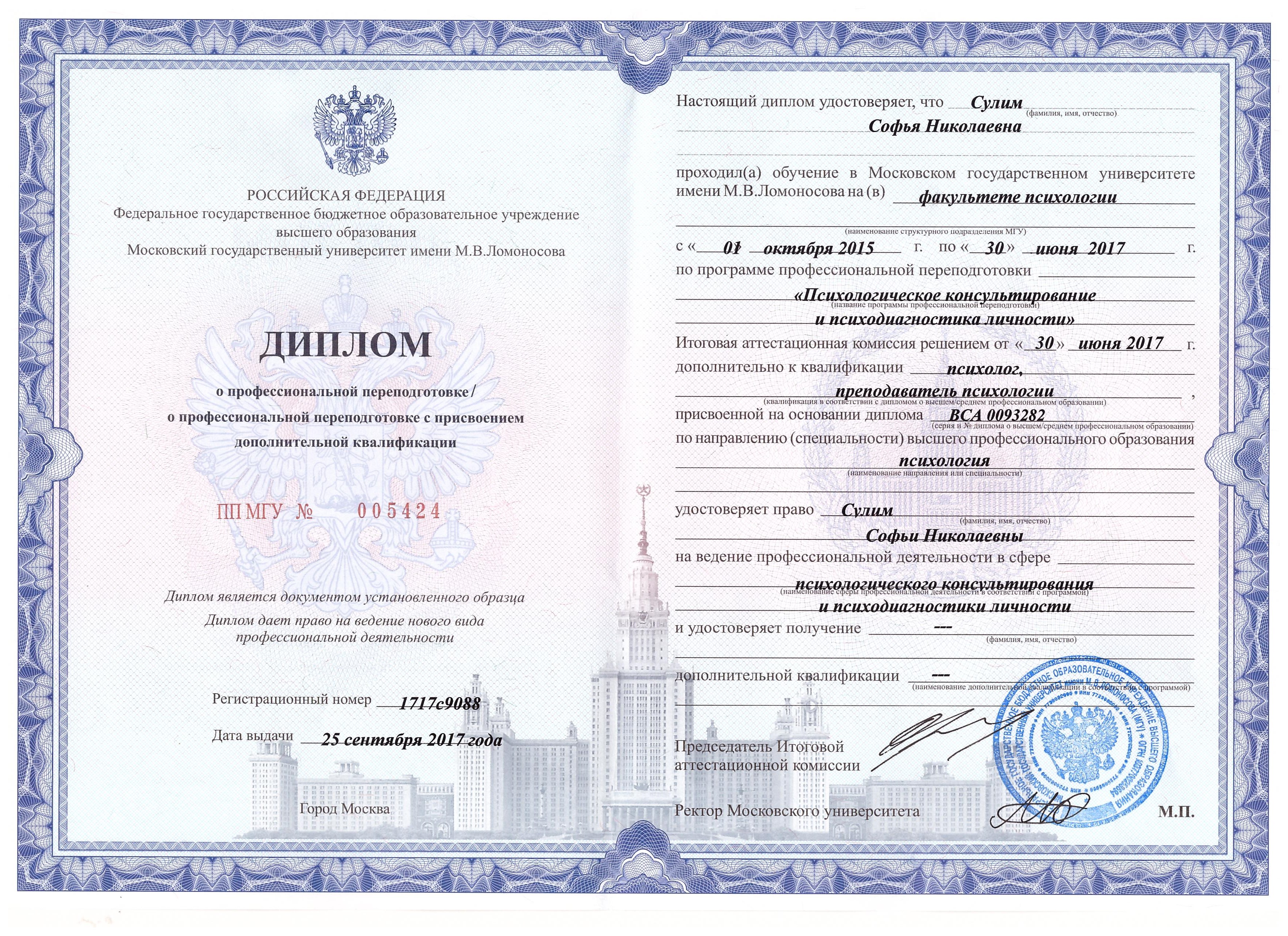 - Московский государственный университет имени М. В. Ломоносова (МГУ), «Психологическое консультирование и психодиагностика личности», диплом с отличием, 2017 г.