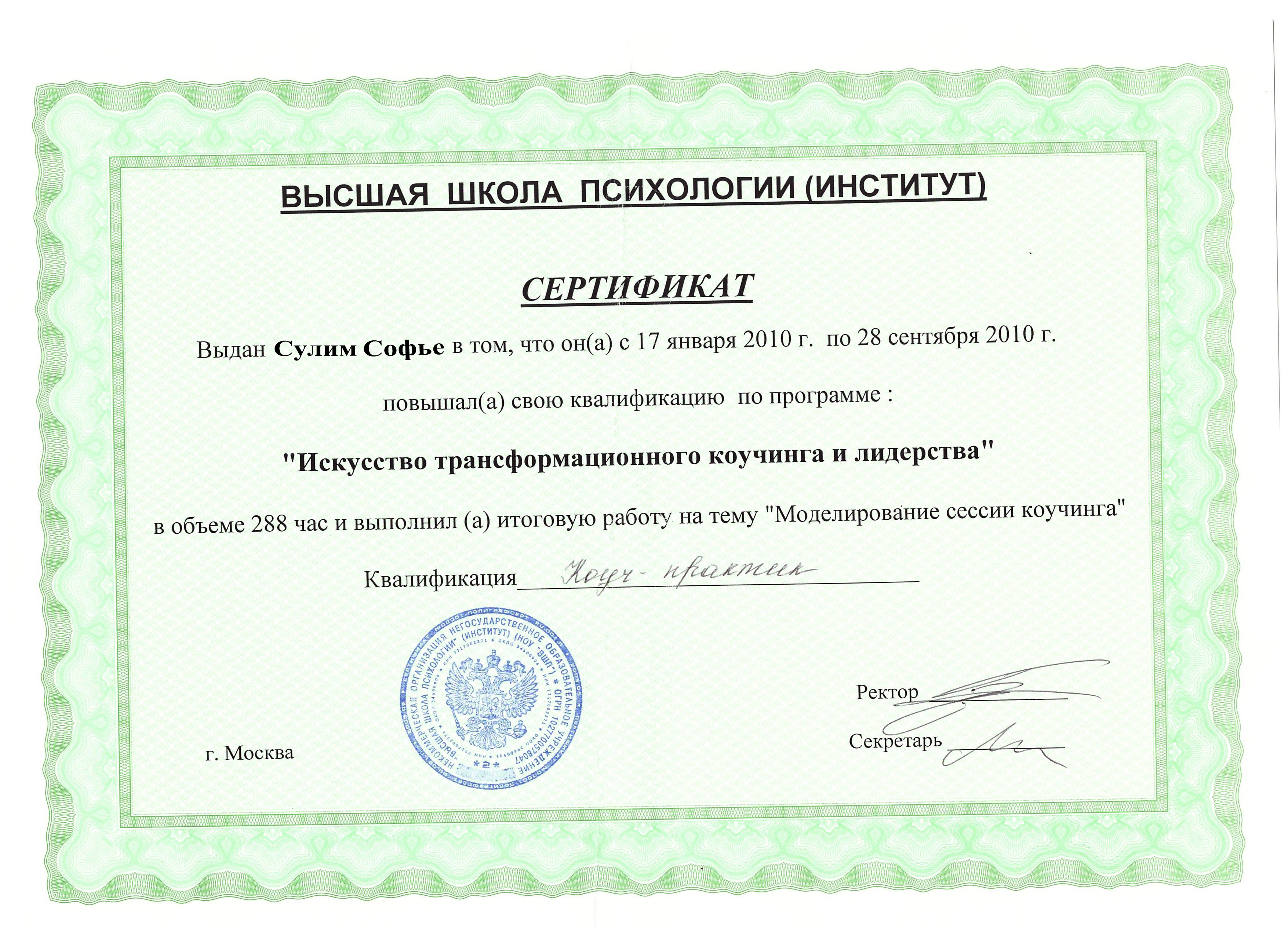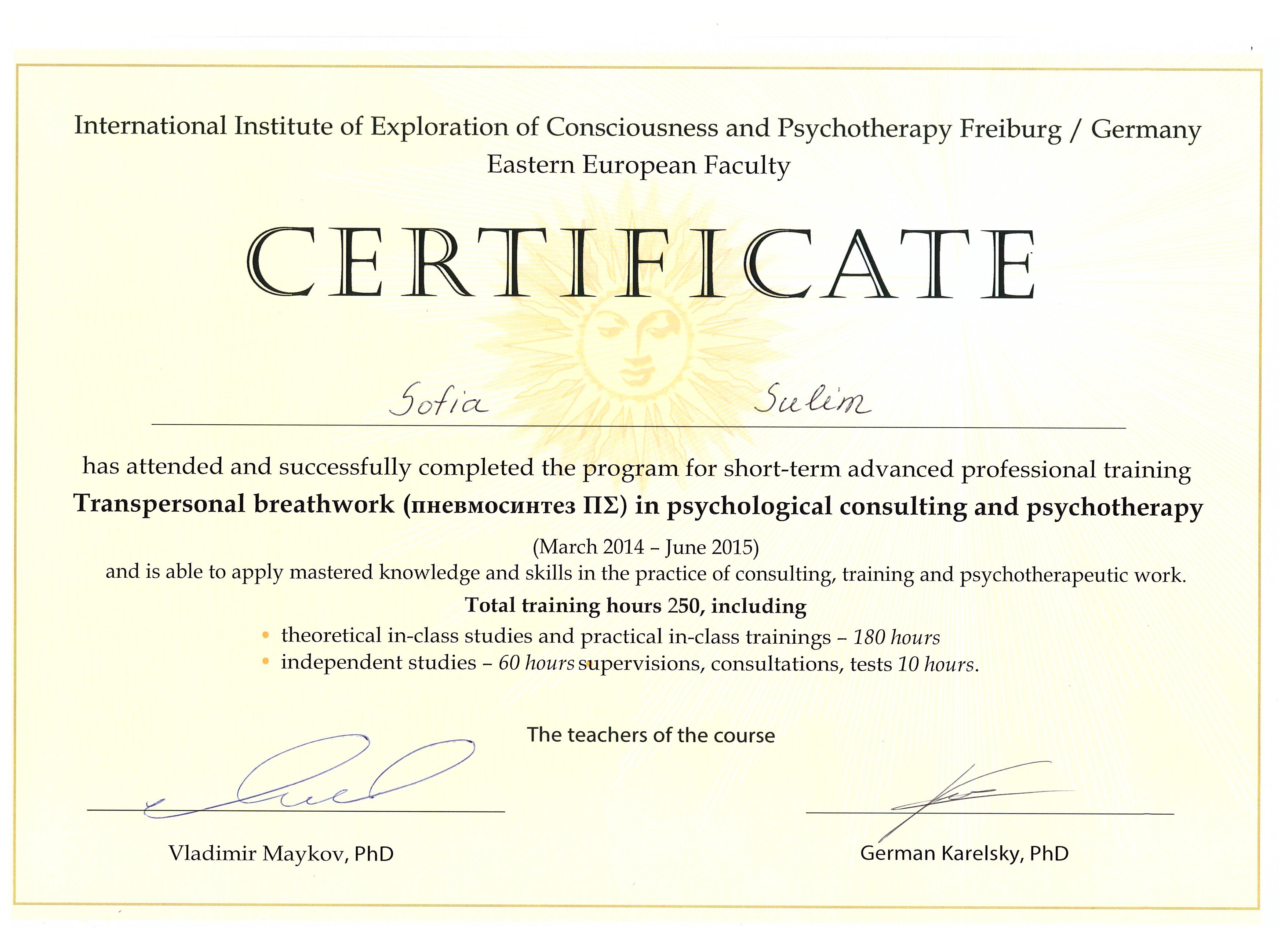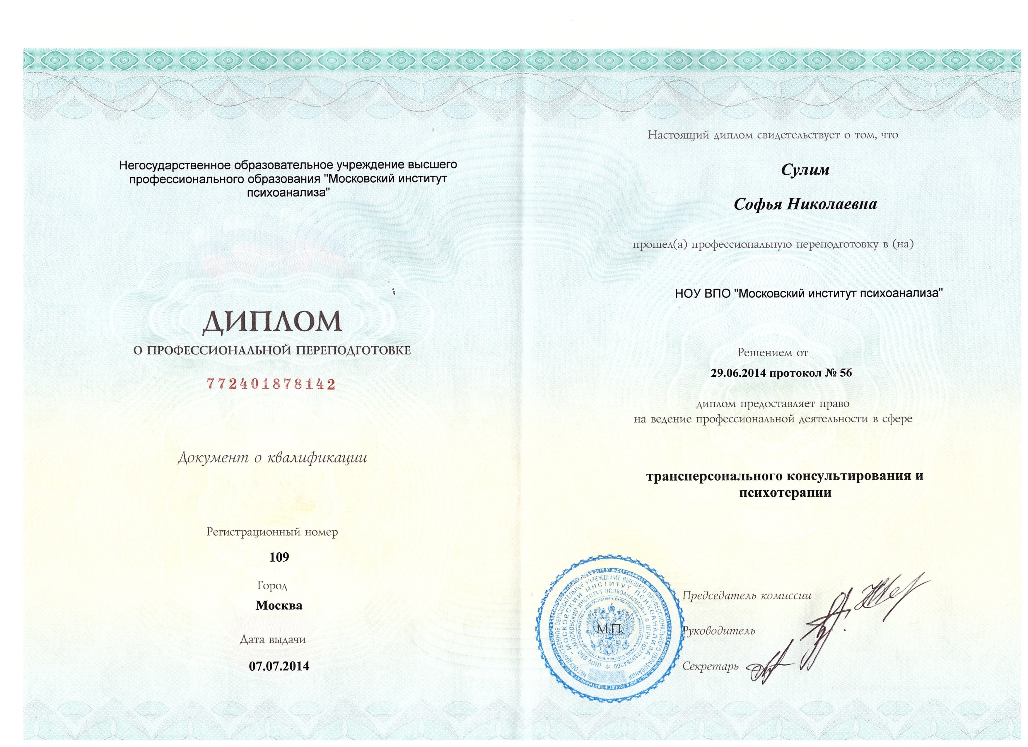 - «Трансперсональное консультирование и психотерапия», Институт психоанализа, Москва. Диплом трансперсонального психотерапевта.