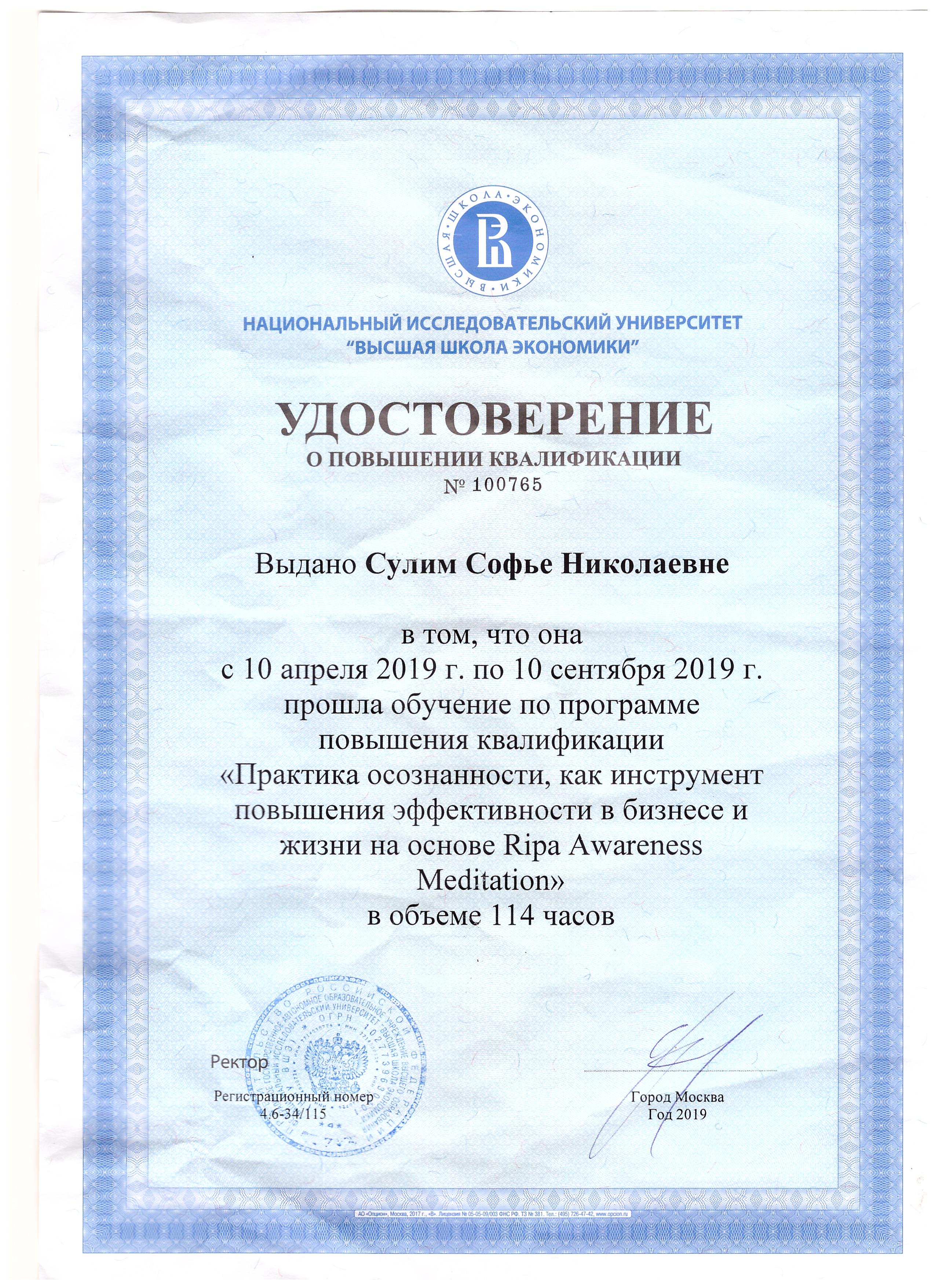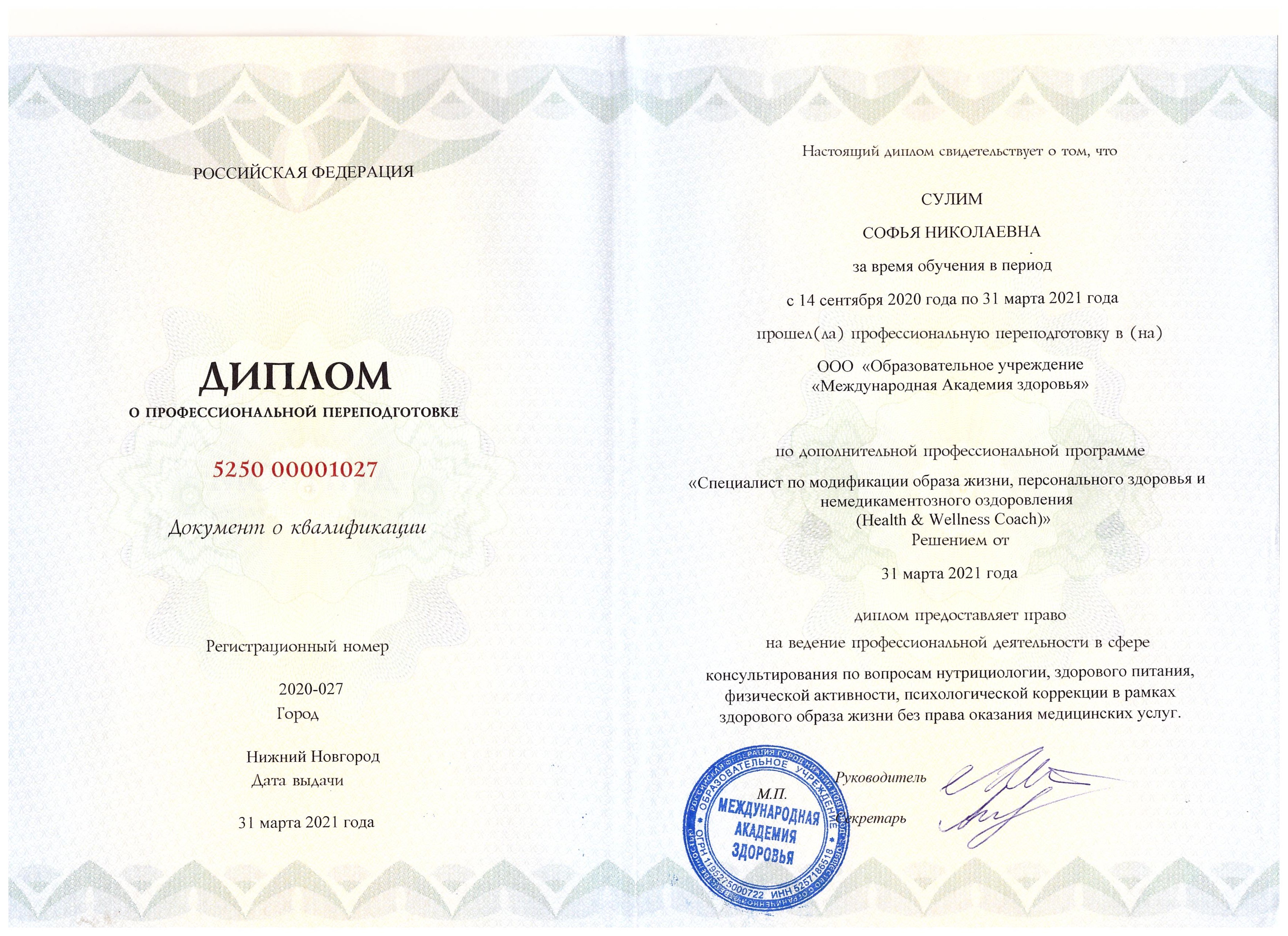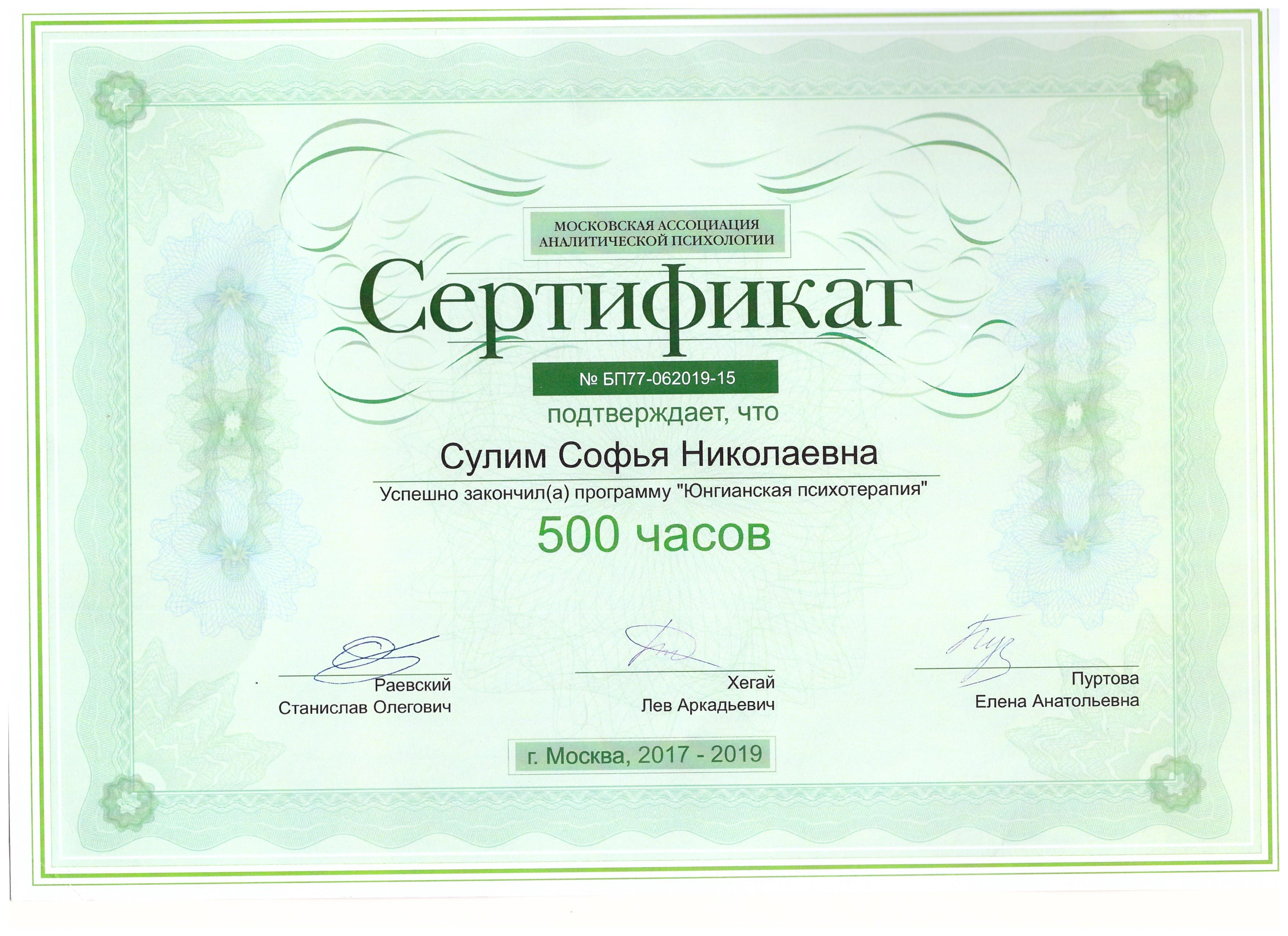 - «Трансперсональное консультирование и психотерапия», Институт психоанализа, Москва. Диплом трансперсонального психотерапевта.