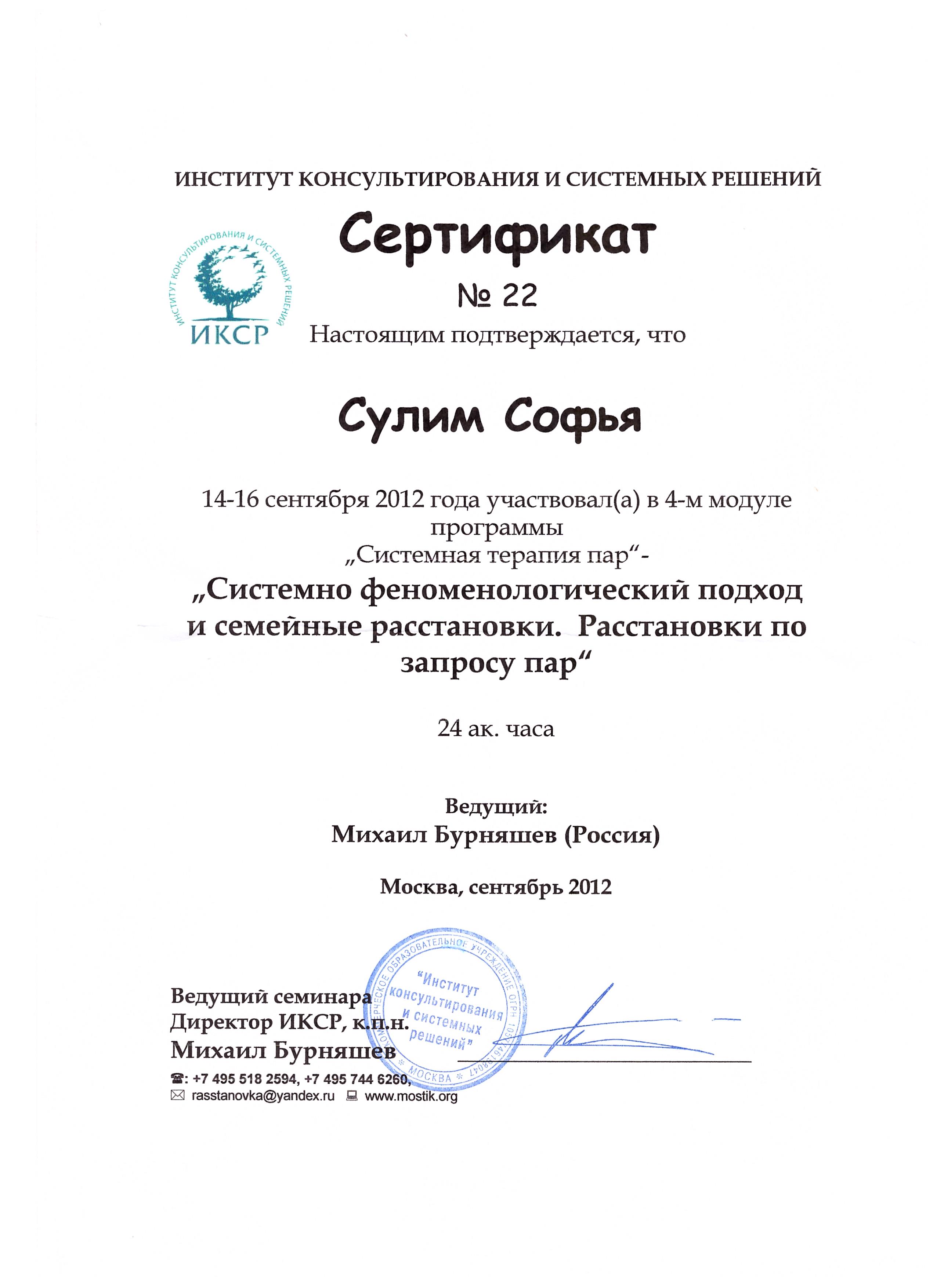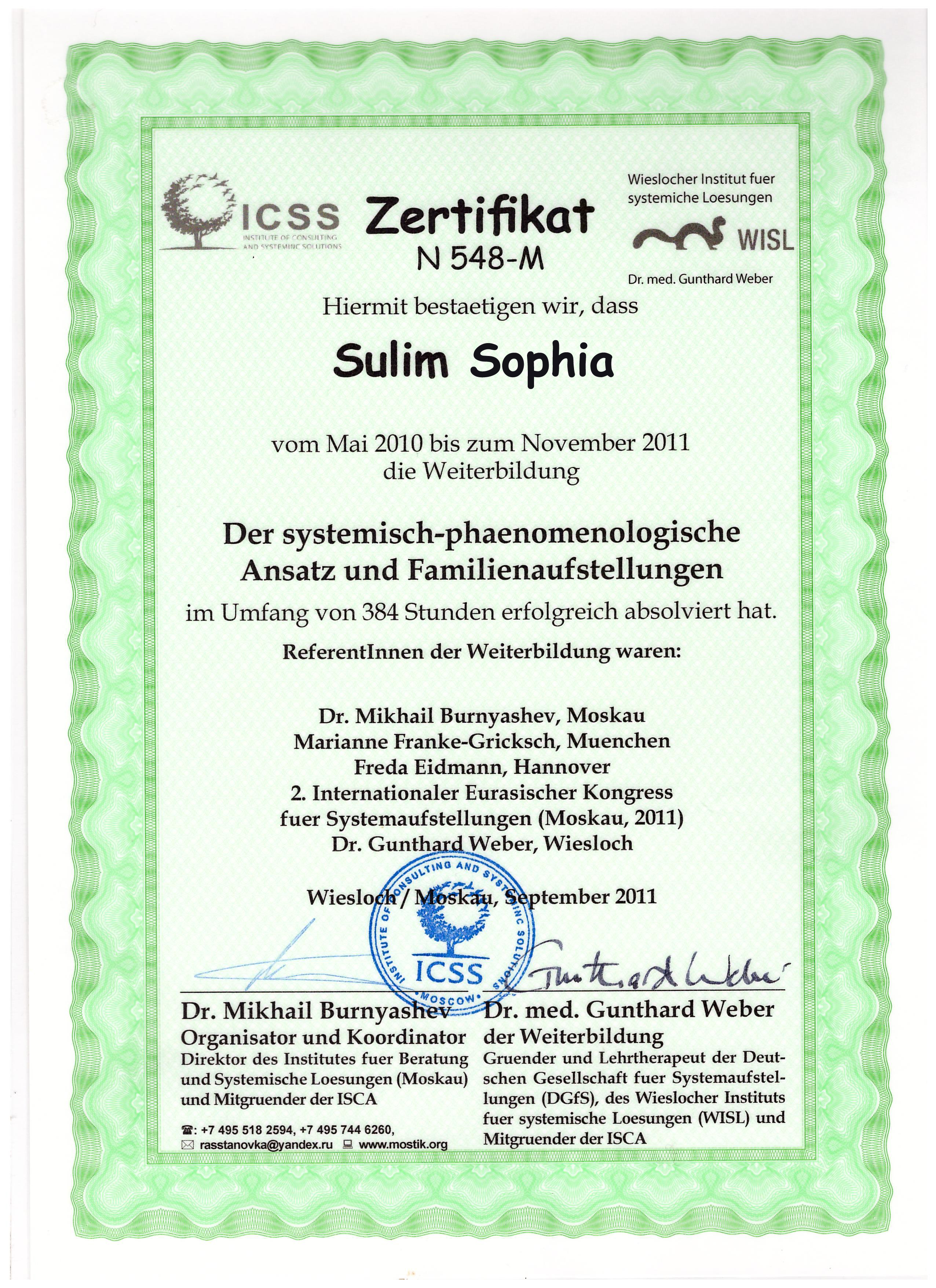 - "Системно-феноменологический подход и семейные расстановки" (расстановки по Берту Хеллингеру), Институт консультирования и системных решений (Москва) и Вислохский Институт системных решений (Германия), 2-годичная программа. Сертификат.