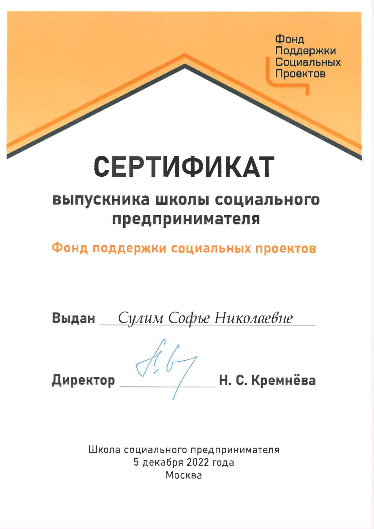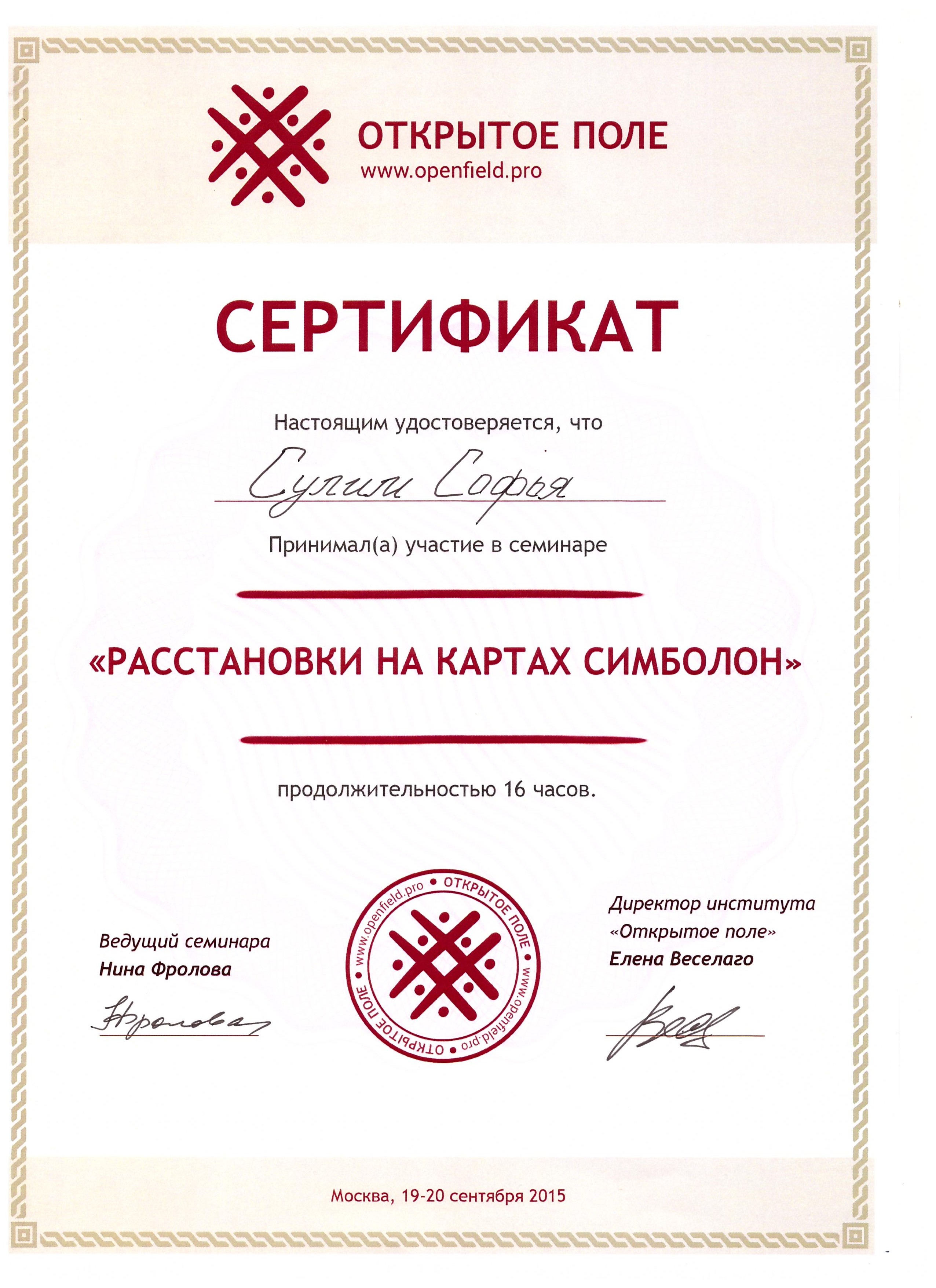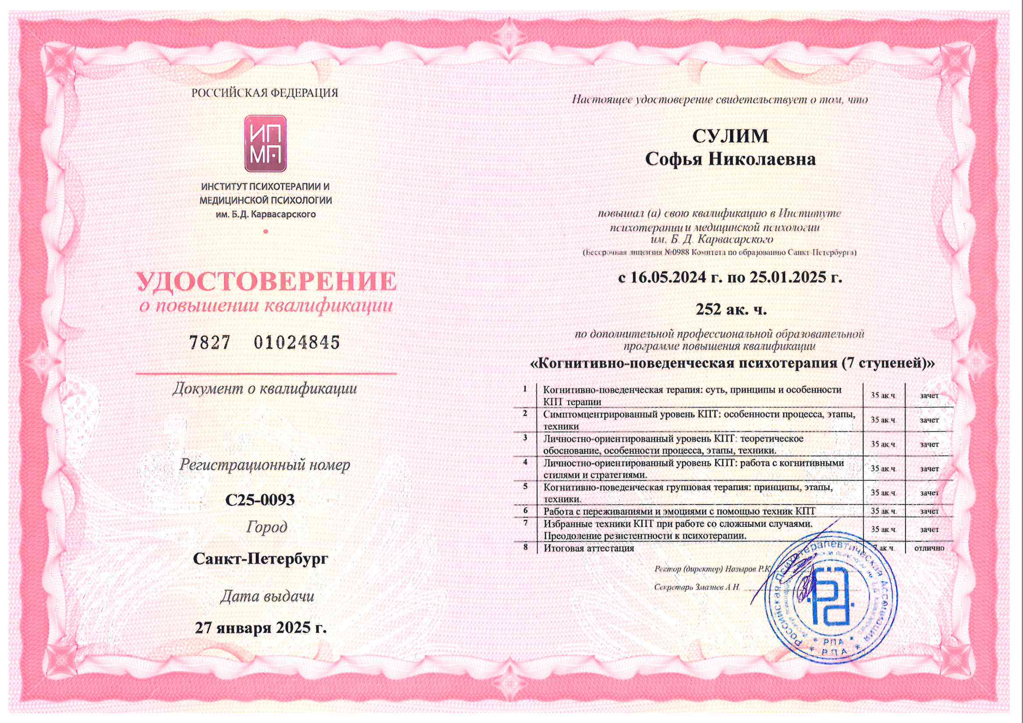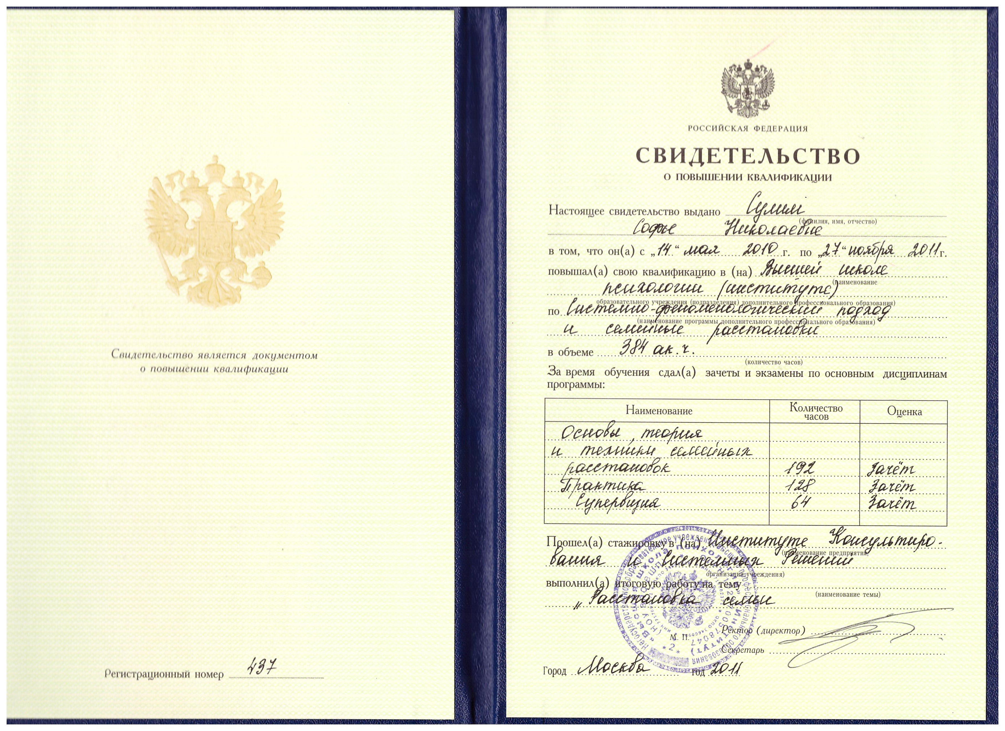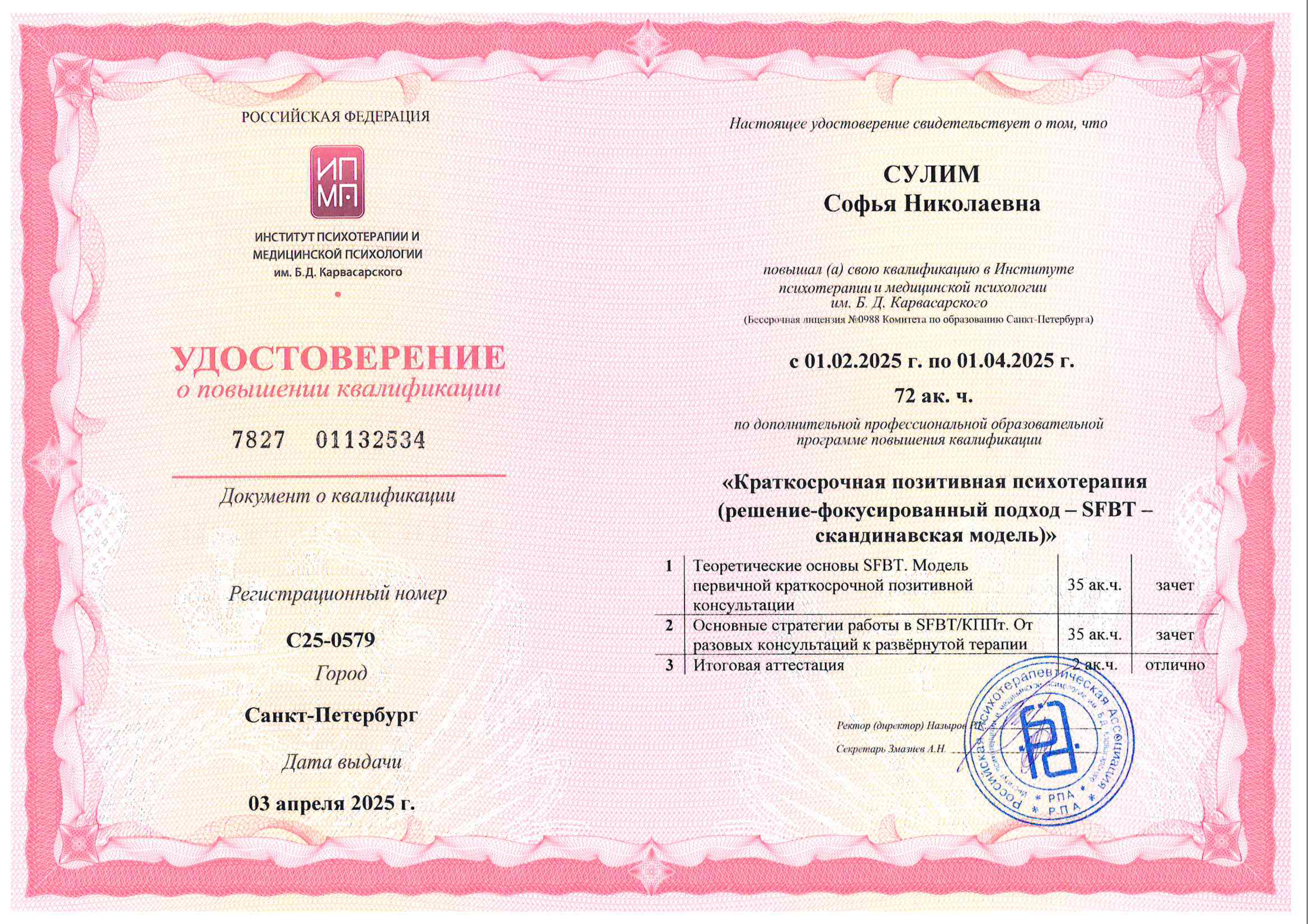 - «Краткосрочная позитивная психотерапия» (решение-фокусированный подход – SFBT – скандинавская модель). Институт психотерапии и медицинской психологии им. Б.Д. Карвасарского, г. Санкт-Петербург, годовая программа. Удостоверение о повышении квалификации.