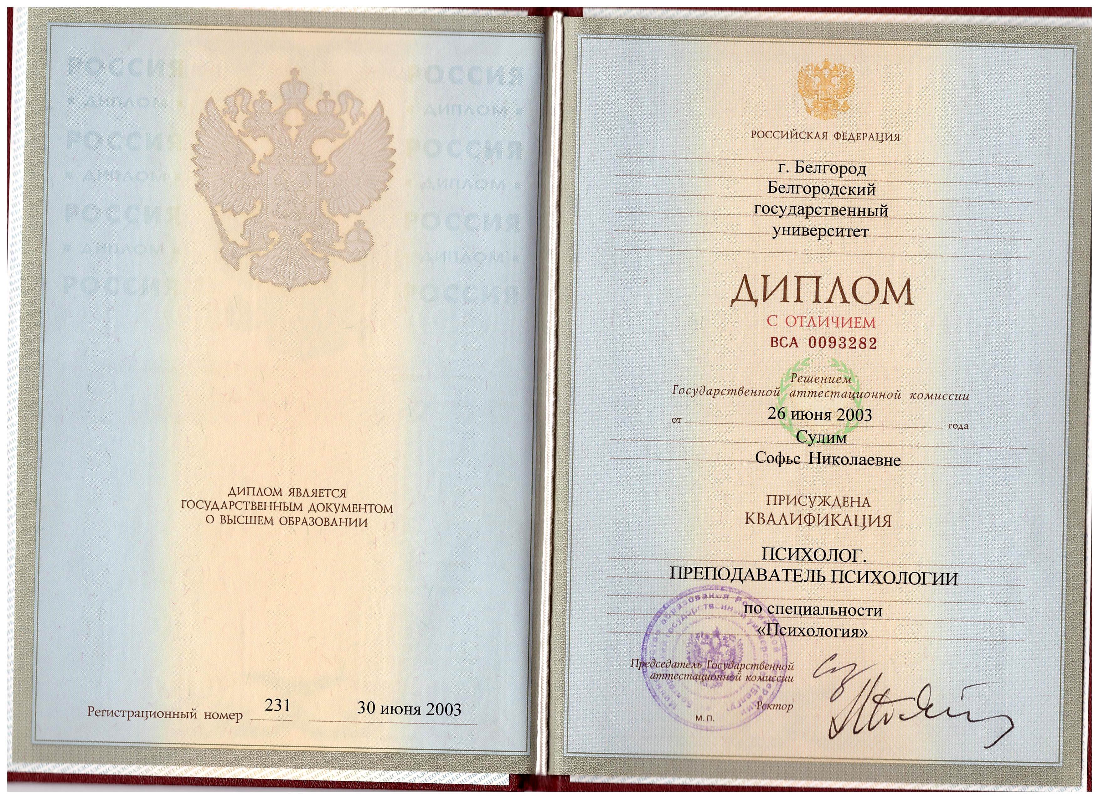 - Белгородский государственный университет: социальный психолог, диплом с отличием, 2003 г.