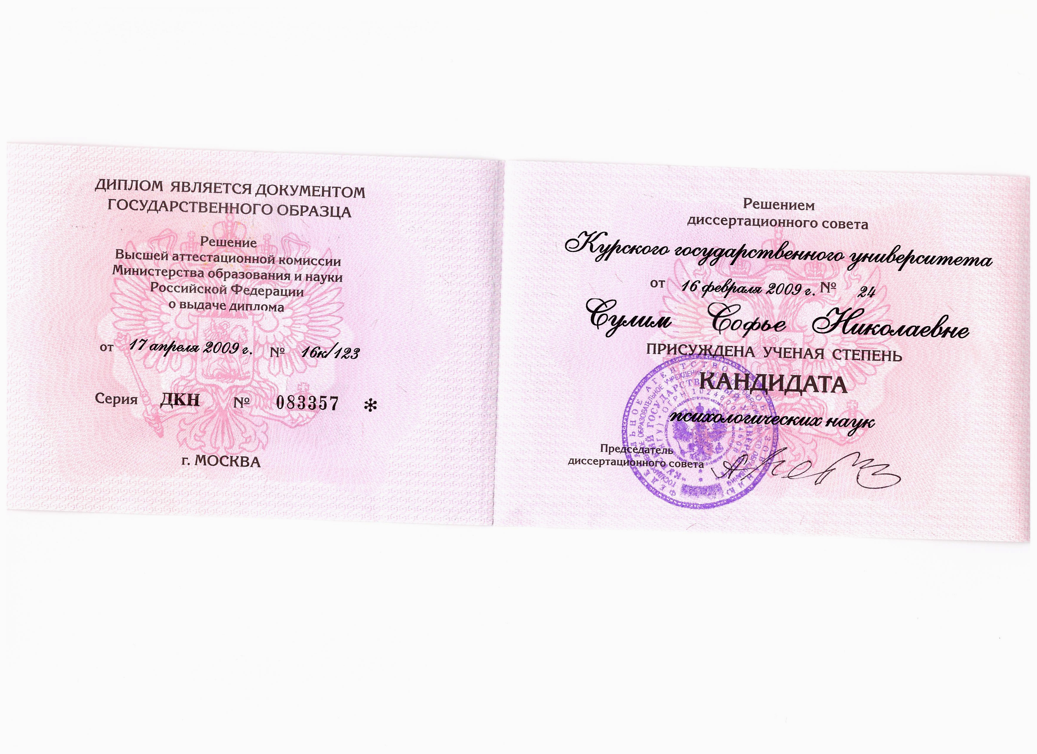 Белгородский государственный университет: аспирантура, кандидат психологических наук, 2009 г.