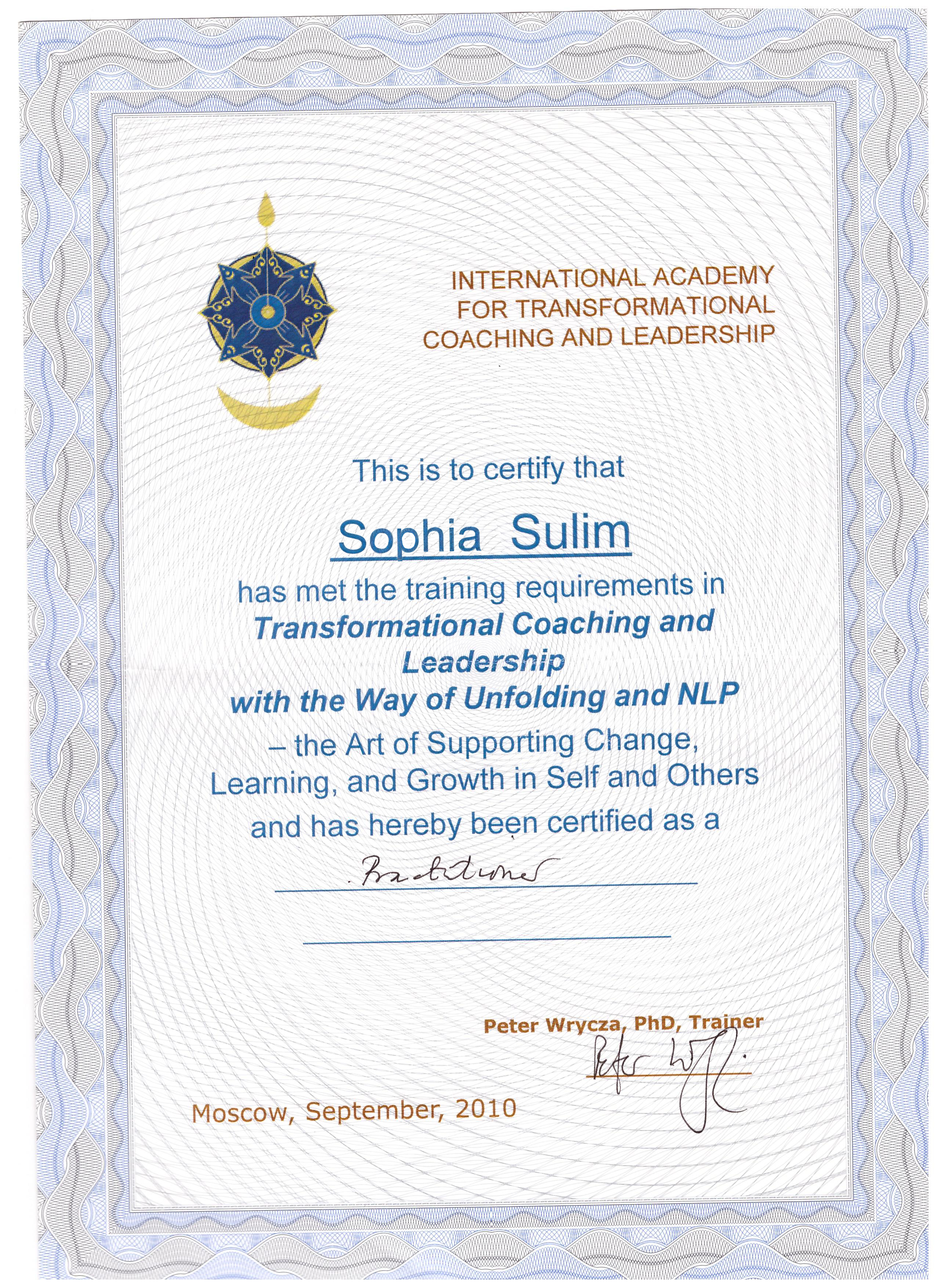 - Международная программа системной подготовки трансформационных коучей «Искусство коучинга и лидерства» Питера Врицы, Международная Академия Трансформационного Коучинга и Лидерства (IATCL), Москва – Бали (Индонезия). Международный сертификат.