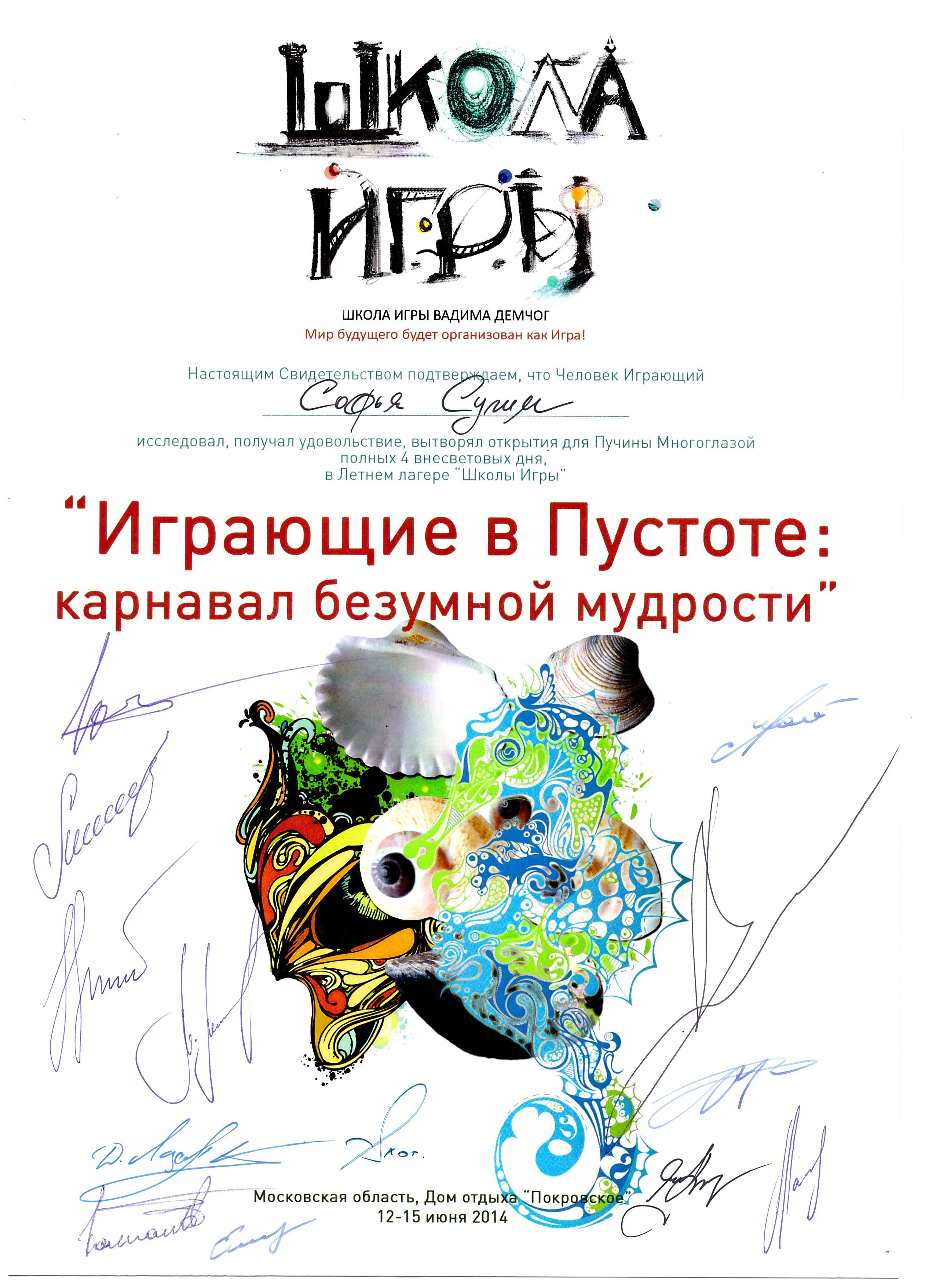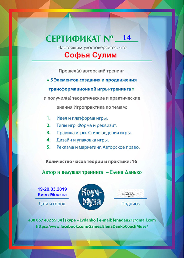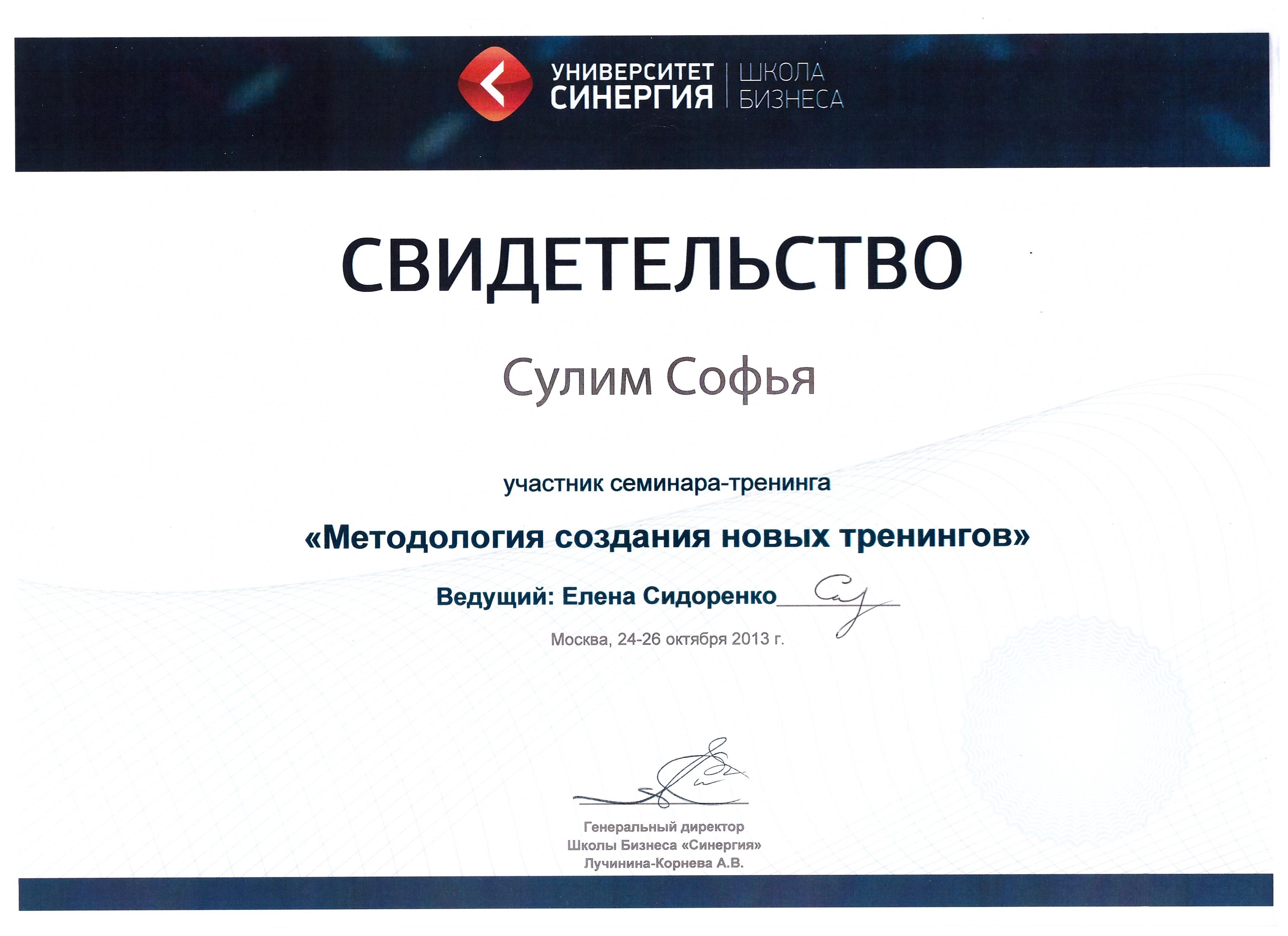 - «Методология создания тренинга» Елены Сидоренко, Москва. Сертификат.