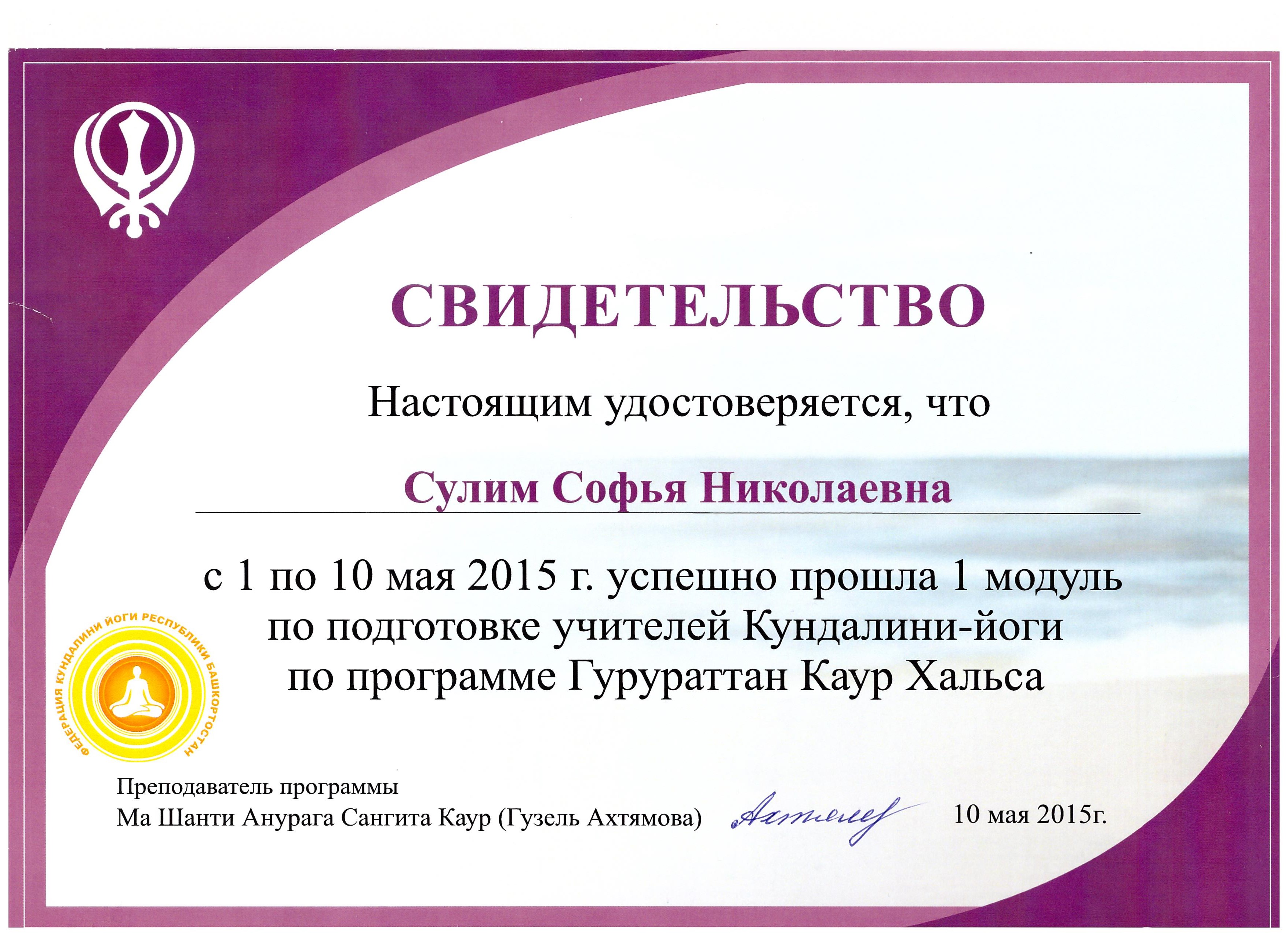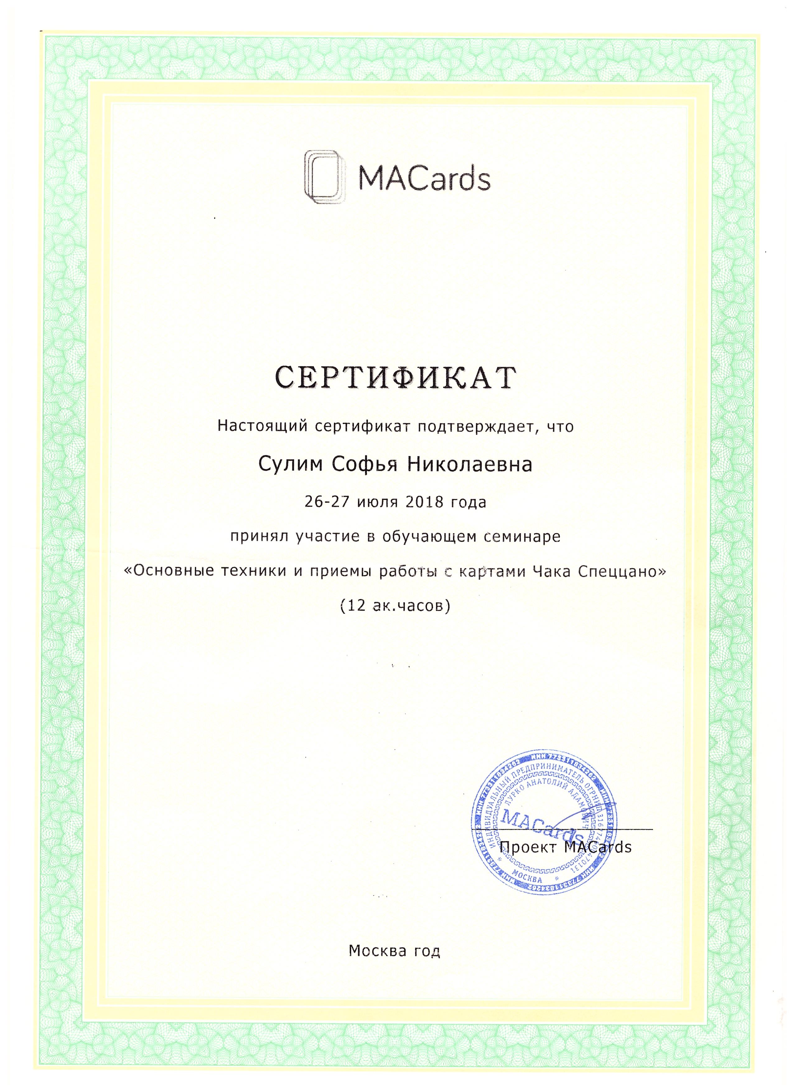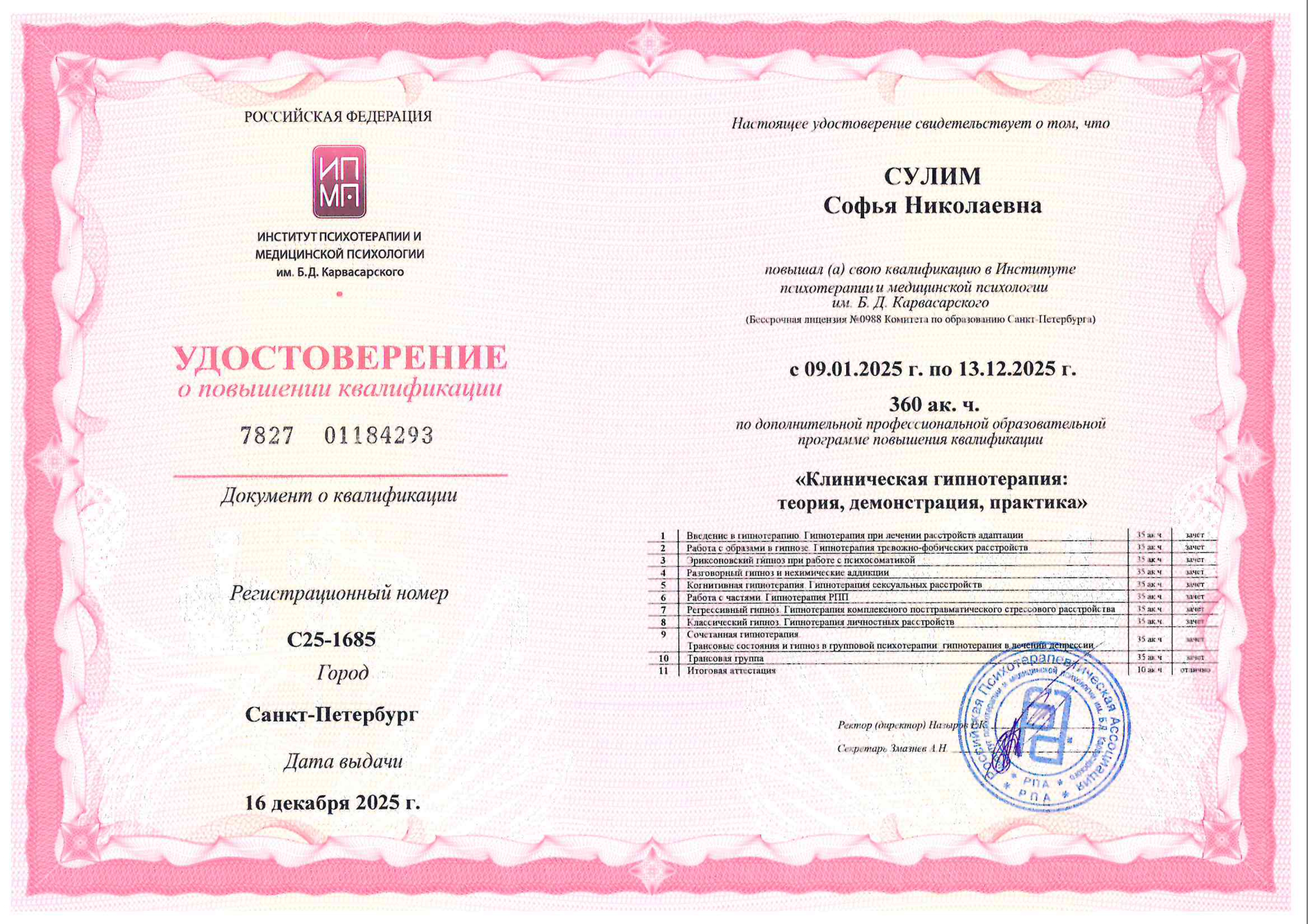 - «Клиническая гипнотерапия»: теория, демонстрация, практика. Институт психотерапии и медицинской психологии им. Б.Д. Карвасарского, г. Санкт-Петербург, годовая программа. Удостоверение о повышении квалификации.