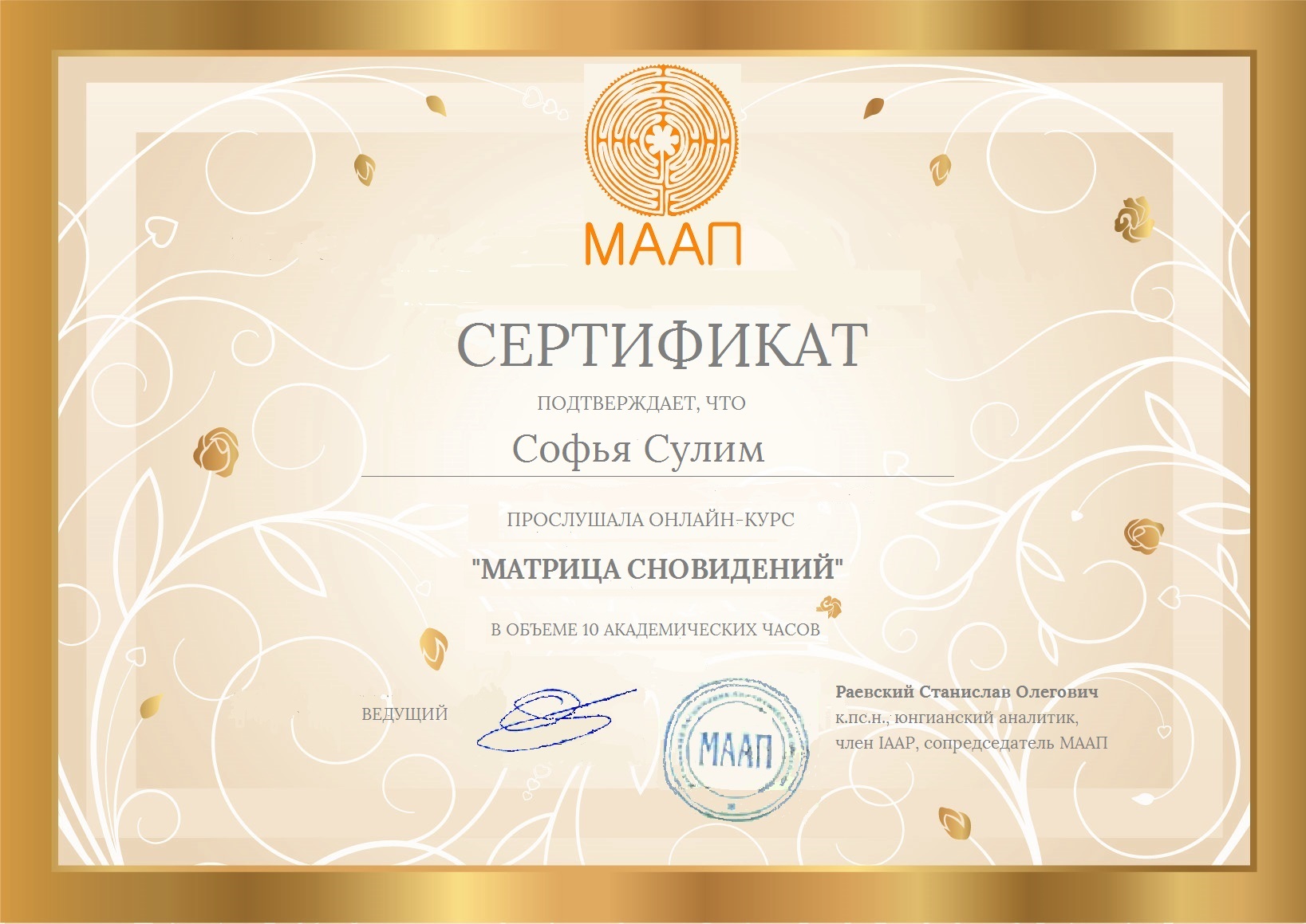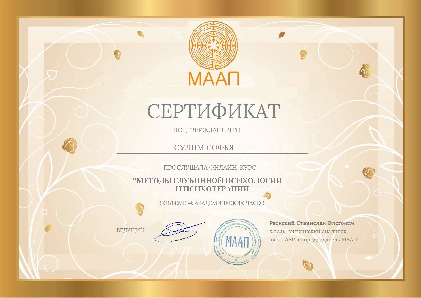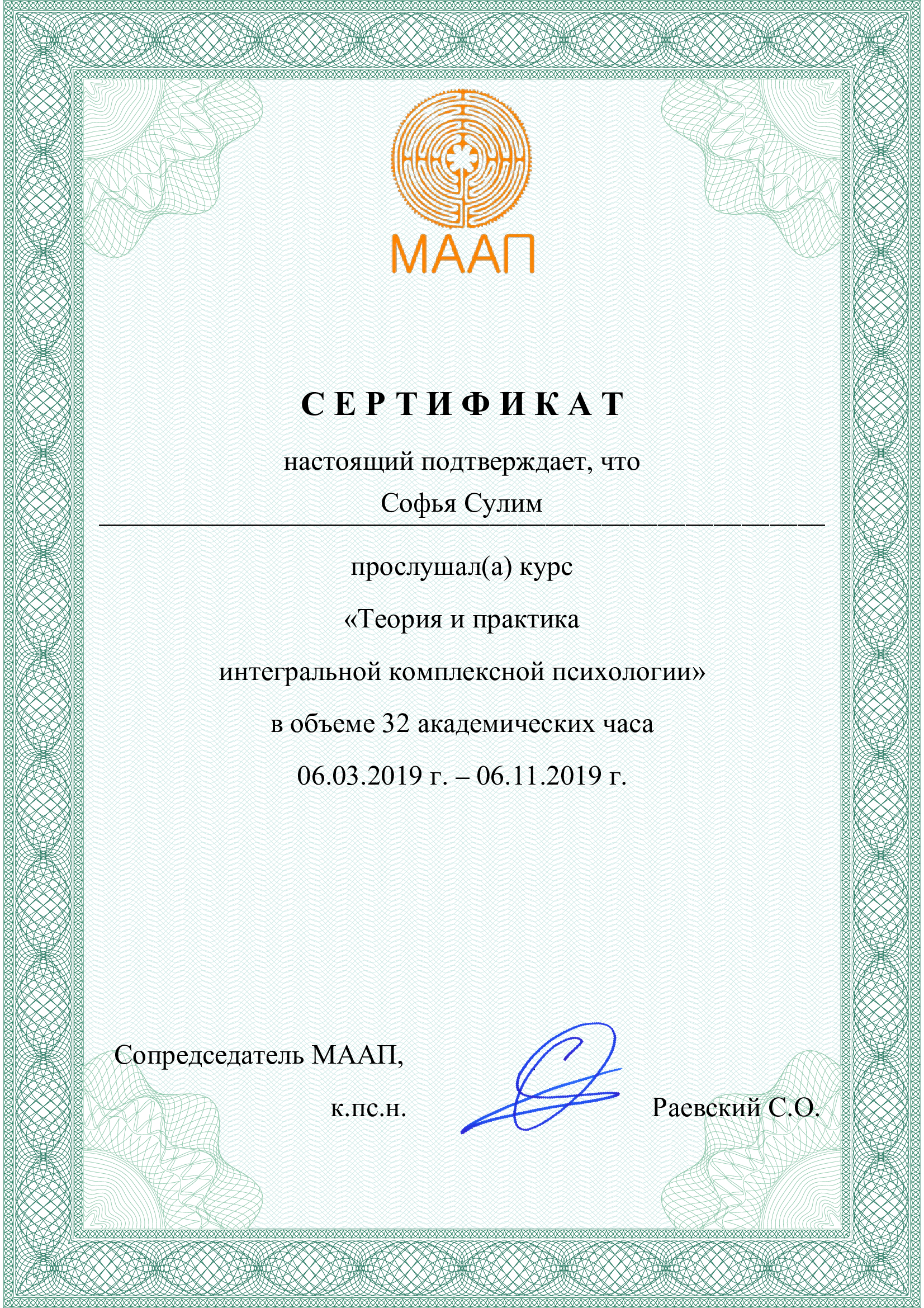- Программы: «Матрица сновидений», «Методы глубинной психологии и психотерапии», «Интегральная комплексная психотерапия», «Глубинная психология любовных отношений» С.О. Раевского на базе Московской аналитической ассоциации психологии (МААП).