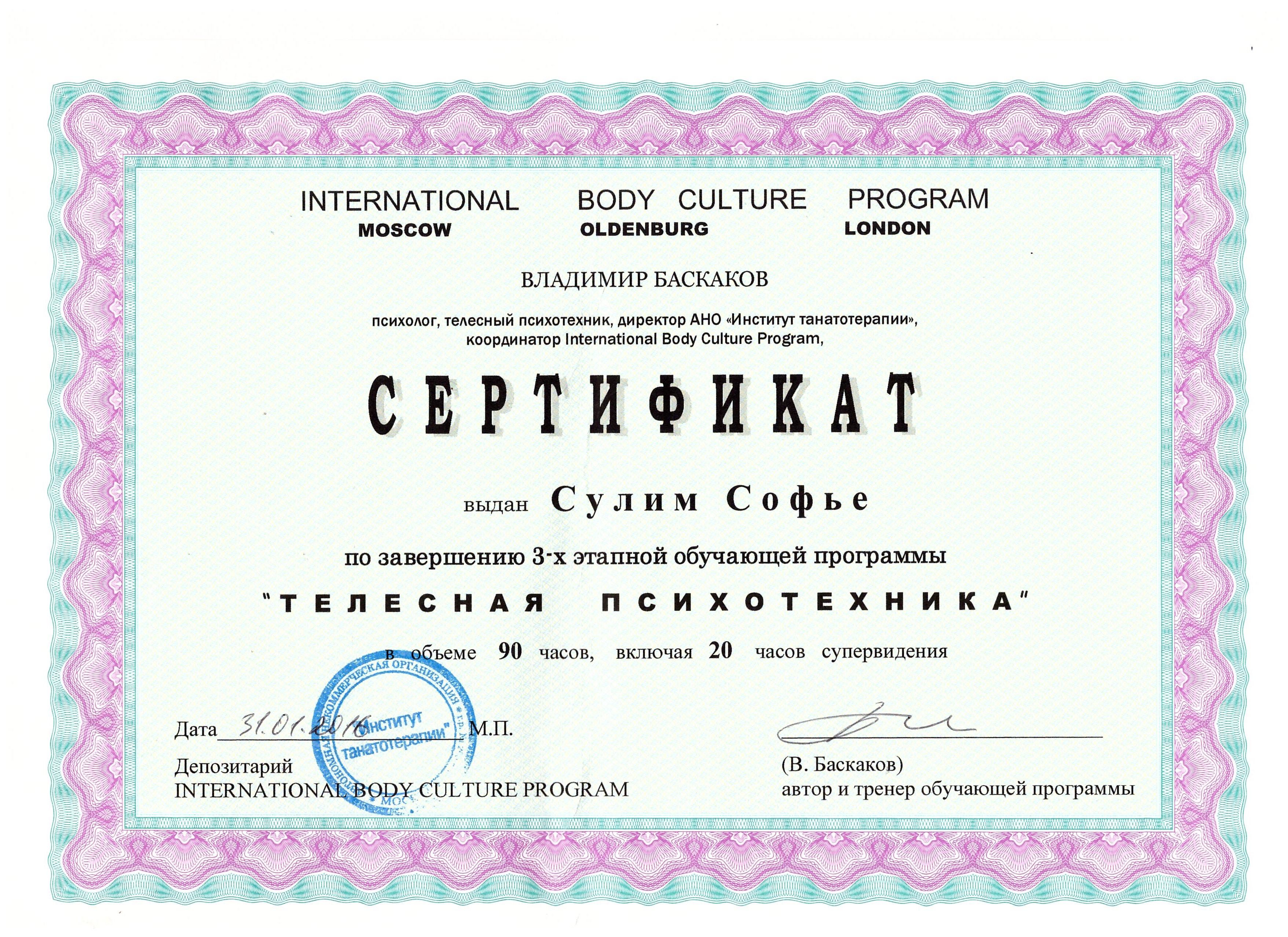 - «Телесно-ориентированная психотерапия и психотехника», Международная программа "Культура тела" (Россия, Германия, Великобритания), Институт Танатотерапии, ведущий В.Ю. Баскаков. Сертификат.