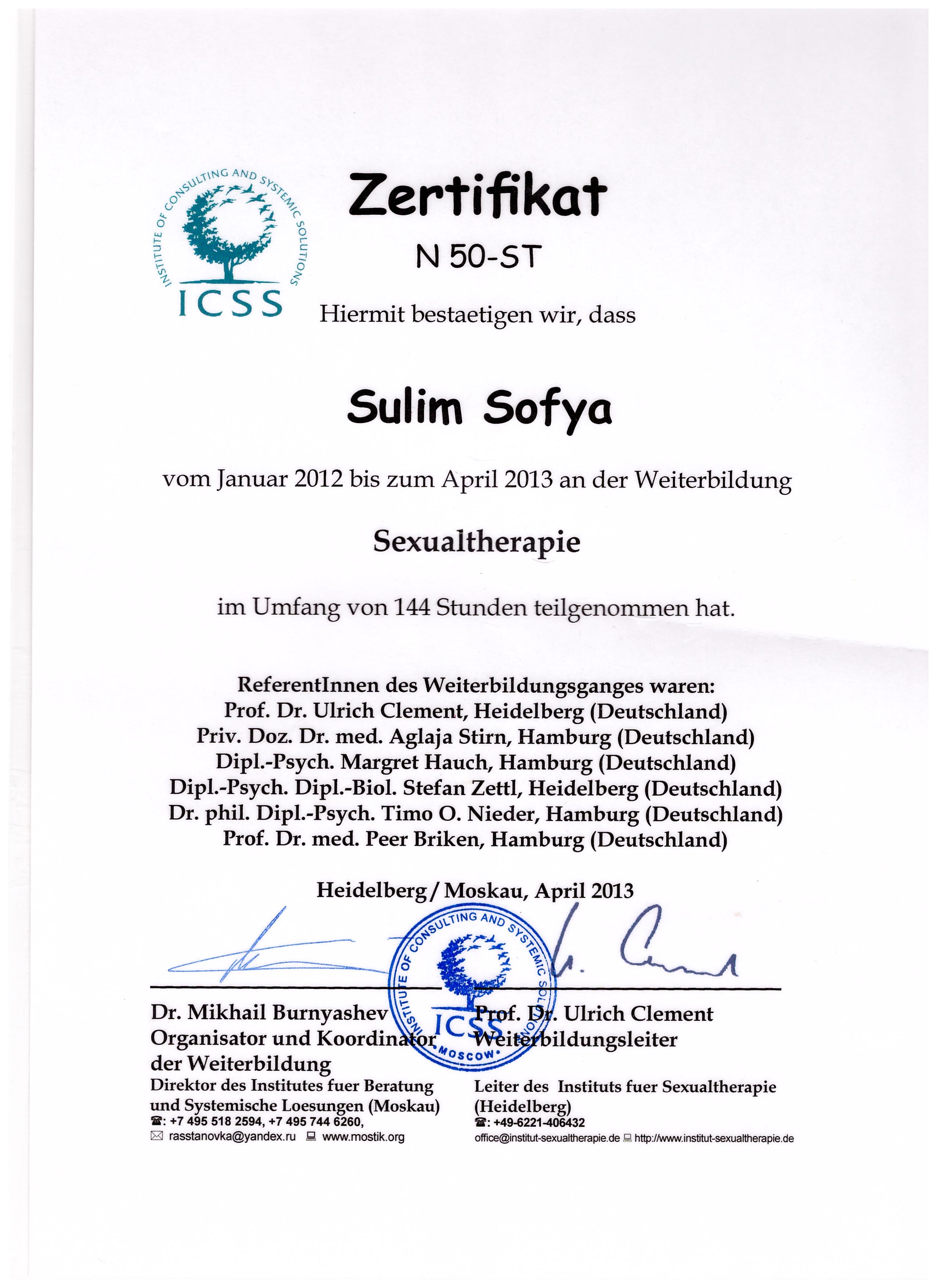 - "Системная сексуальная терапия", Institut fur Sexualtherapie Heidelberg (Институт сексуальной терапии, Гейдельберг, Германия) и Институт консультирования и системных решений (Москва). Годовая программа. Международный сертификат.