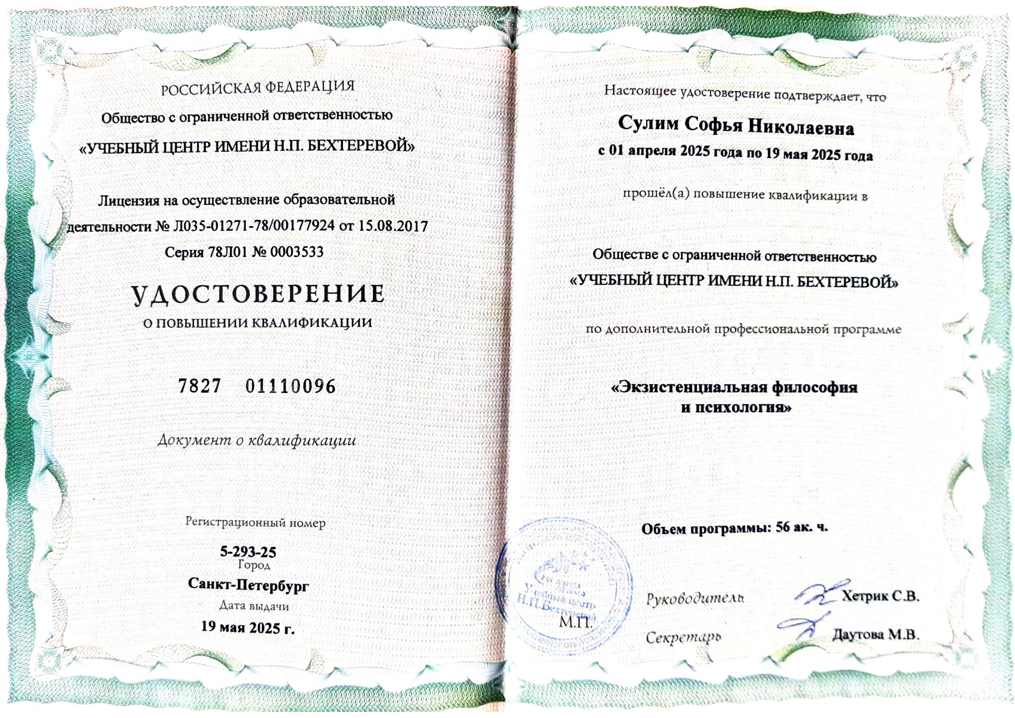 - "Экзистенциальная философия и психология", Учебный центр им. Н.П. Бехтеревой, г. Санкт-Петербург. Удостоверение о повышении квалификации.