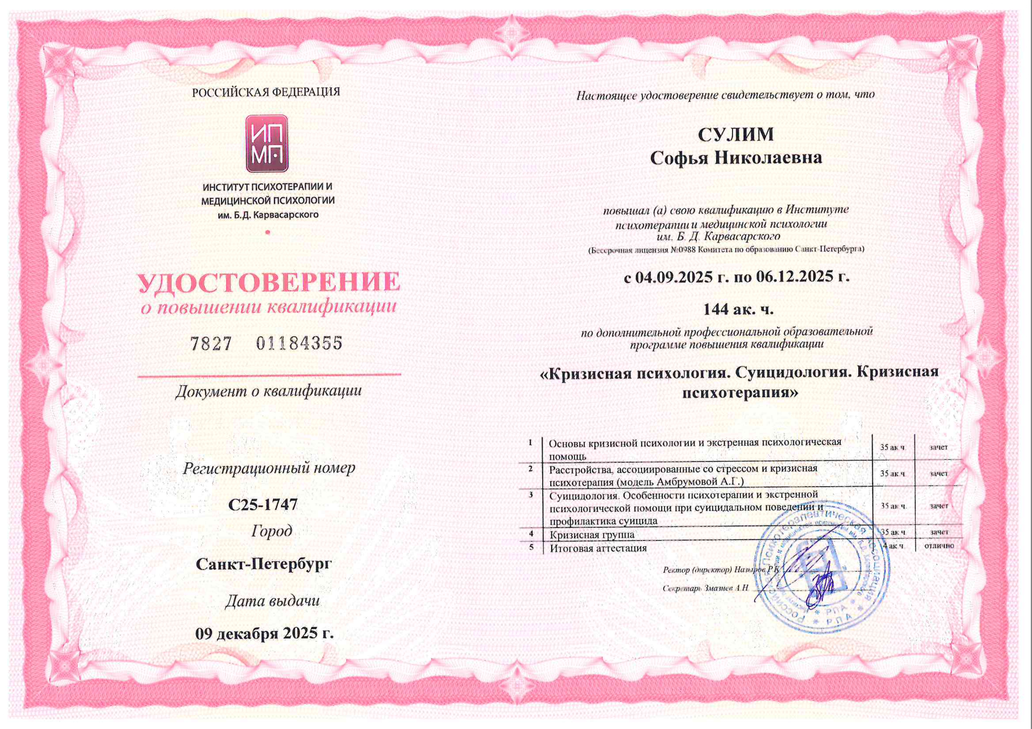 - "Кризисная психология, кризисная суицидология, кризисная психотерапия", Институт психотерапии и медицинской психологии им. Б.Д. Карвасарского, г. Санкт-Петербург. Удостоверение о повышении квалификации, 144 ч.